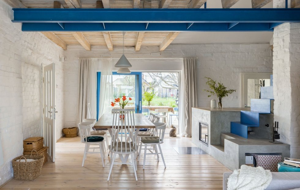 Как восстановить дом и не потерять его душу Место: Словакия Метраж: 130 м² Дизайн: Jana Benková Фото: Matej Hakár Проект начался с поездки в деревню, где будущий владелец, известный словацкий кинорежиссёр, наткнулся на старый кубический дом с пристройкой в саду. С первого взгляда стало ясно, что это идеальное место для его творческих проектов. Основная цель заключалась в сохранении оригинальных элементов здания, сочетая их с современными решениями. Важным аспектом было создание пространства, способного вместить 10-12 человек, включая съёмочную группу, чтобы проводить здесь рабочие встречи и творческие сессии. Архитекторы решили сохранить аутентичность дома, не жертвуя современными удобствами. Оригинальные черты здания, такие как деревянные балки и кирпичные стены, были тщательно восстановлены. В то же время, были добавлены современные элементы, чтобы улучшить функциональность. В результате дом стал не только исторически значимым, но и практичным для повседневной жизни. Переход между ст