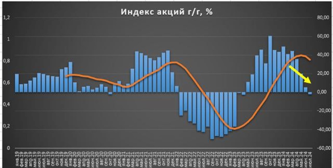 Напомню, что устойчивое замедление в акциях началось с апреля 2024 года, на практике это часто предвестник спада. Индекс "страха" (волатильности) перешёл к росту и подтверждает негативные настроения в акциях.