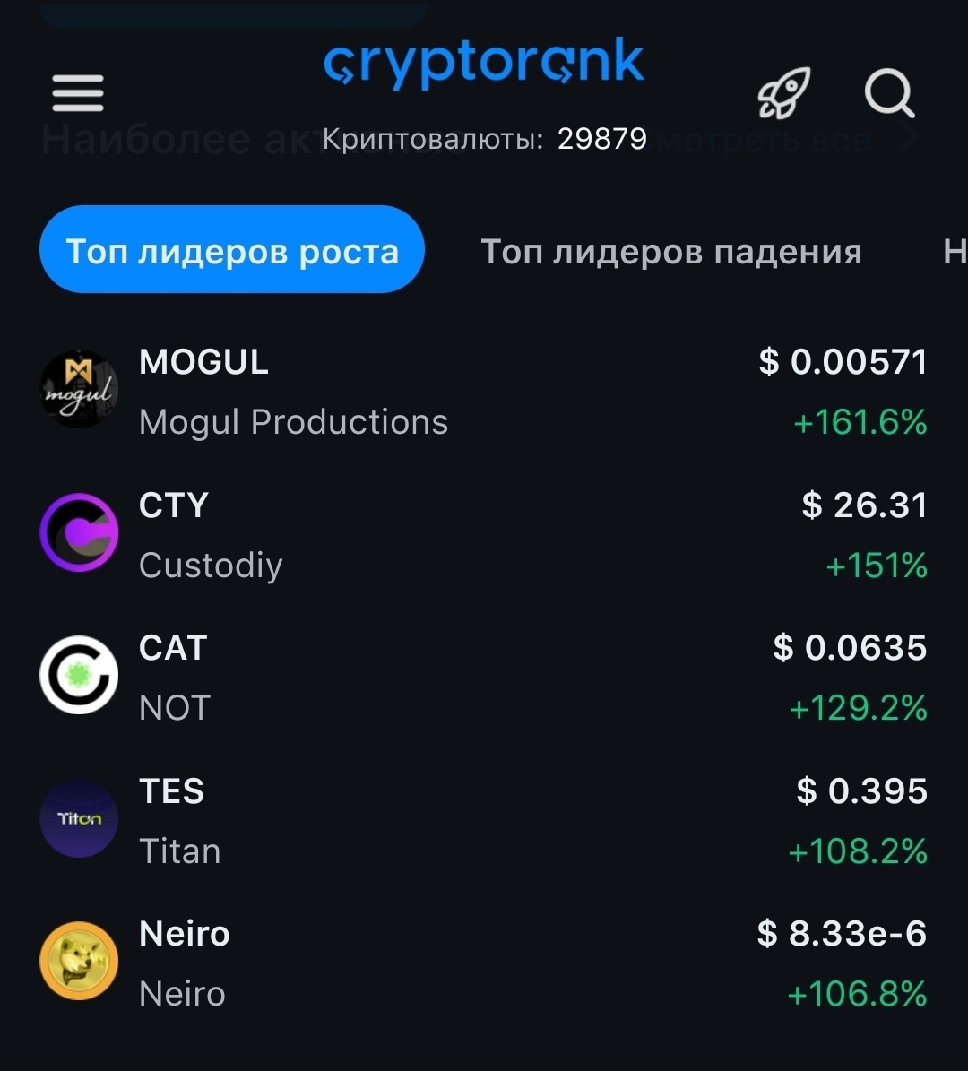 Данный контент не является финансовой рекомендацией. Проводите собственный анализ и принимайте самостоятельные решения. Топ 5 активов роста по данным платформы CryptoRank: 1. Mogul Productions (MOGUL) +162% Данные анализа DAWR (переоцененность) 2. Custodiy (CTY) +151% Данные анализа DAWR (переоцененность) 3. NOT (CAT) +129% Данные анализа DAWR (переоцененность) 4. Titan (TES) +108% Данные анализа DAWR (переоцененность) 5. Neiro (Neiro) +107% Данные анализа DAWR (переоцененность) При покупке высокорисковых активов соблюдайте риск-менеджмент и не забываете проводить DYOR. DYOR - это проведение самостоятельного детального анализа актива с целью оценить перспективность его покупки. #DAWR #криптовалюты #Boosty #MOGUL #CTY #CAT #TES #Neiro