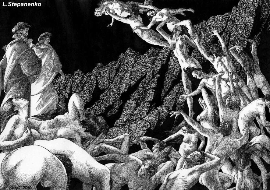 Сегодня погрузился чуть дальше, а именно на второй круг Ада Данте... Это круг для душ, совершивших грехи страсти и похоти. Они наказываются вечными штормами, символизирующими бурю их страстей. Охраняет 2 круг царь Минос. Здесь встречаются Франческа да Римини и Паоло (исторические личности), чья трагическая история любви представляет пример страстного греха, а также, например, Елена Прекрасная и Клеопатра. А вот и мое творение: Бродя в скитаниях а пустоте Забыл о свете я в глазах, Но вдруг увидел в далеке Светило, что вселяло страх. "Чего бояться мертвецу?"- Пошёл на свет, стирая ноги, Коль есть надежда к существу- Душа прильнет к любой дороге, Откажут ноги, доползу... ... Чем ближе подходил я к свету, Тем больше прояснялся образ, Был трон тот, и на троне этом Сидел властитель в море слез. Пред троном на коленях тени Ревут и просят о смиреньи, Но взгляд пронзает словно меч, И справедливость - "глава с плеч" Вердикты оглашая громом И пальцем указав во тьму Твоё измотанное тело Вихре