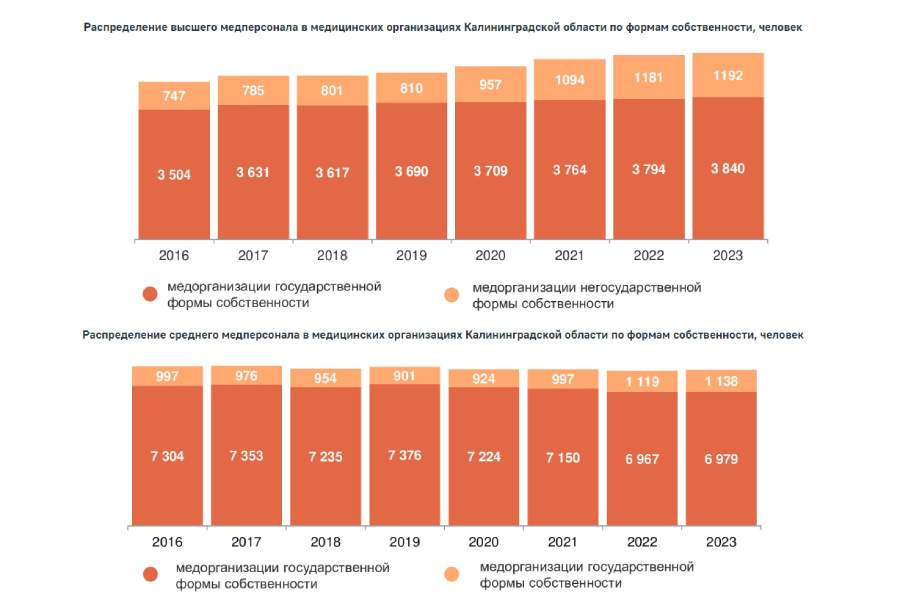 Численность медперсонала в частных клиниках Калининградской области растёт быстрее, чем в государственных учреждениях здравоохранения. Такие данные в своём отчёте приводит Калининградстат. Согласно статистике, количество врачей в регионе за десятилетие 2013-2023 увеличилось почти на 1000 специалистов — с 4234 до 5185. Среднего медперсонала, наоборот, стало меньше на несколько сотен человек: с 8757 до 8450. Отмечается, что за последние семь лет (с 2016 по 2023 годы) количество врачей росло как в частных, так и в государственных клиниках. При этом численность медперсонала в коммерческих организациях росла быстрее, чем в государственных. Так, в медорганизациях негосударственной формы собственности количество врачей выросло с 747 до 1192. В государственных больницах — с 3504 до 3840. Статистика, касающаяся среднего медперсонала, за эти оказалась иной. В 2016 году в госбольницах работали 7304 человек, в 2023 году их насчитали 6979. В частных клиниках их количество, наоборот, увеличилось с 9