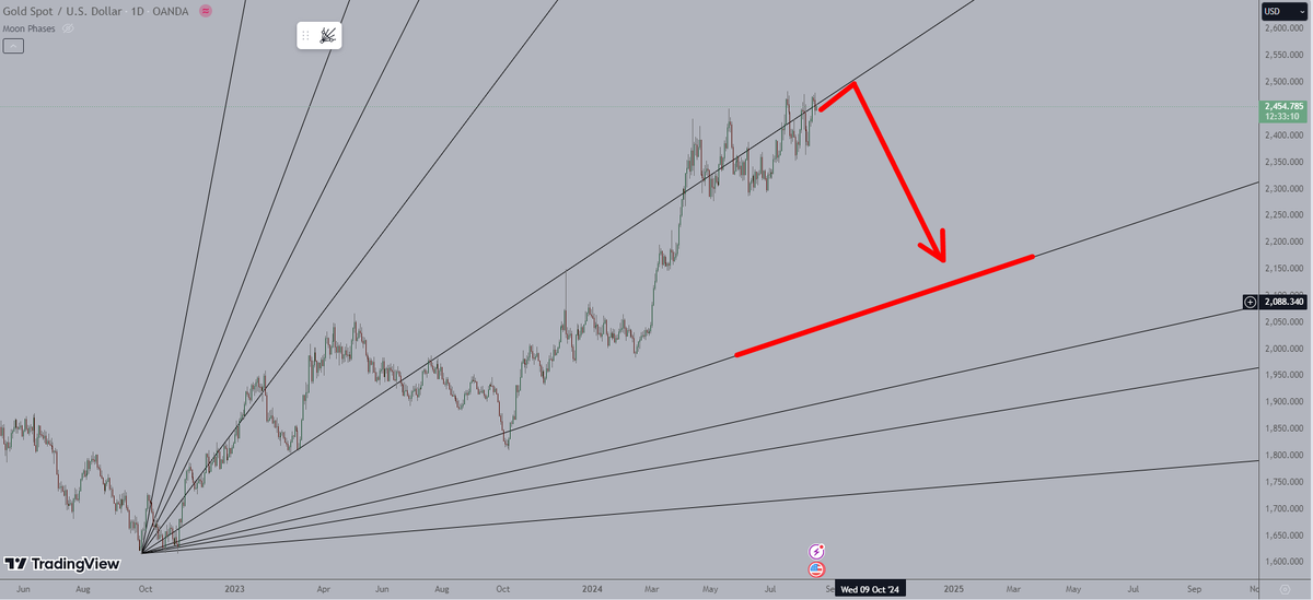 Вернее сказать корректироваться перед дальнейшим ростом и на этой коррекции можно хорошенько проспекулировать в короткую. Все методы анализа, используемые в статье, неоднократно прошли проверку, как бэкстестами, так и в реальных рыночных условиях, поехали. 1. Углы Ганна Цена может продолжать запиливать угол 1/1 немного обновляя экстремумы, чем она и занимается последние полгода. Однако основной вектор направления движения цены в среднесроке это угол 2/1 (красным). 2. Фибо спираль. Последний восходящий свинг на D1 выдыхается, но не большой потенциал для роста остается. Незакрытая цель в районе 2500, но учитывайте, что она динамическая, как и в примере с углами, с течением времени эта цель уменьшается. Цена закрученная по спирали в другую сторону, с использованием более актуальной картинки на правом крае графика встретила довольно сильное сопротивление (ряд пунктирных линий). После пробоя данной поддержки открываются первые локальные цели для снижения - следующий рукав спирали. 3. Зоны л