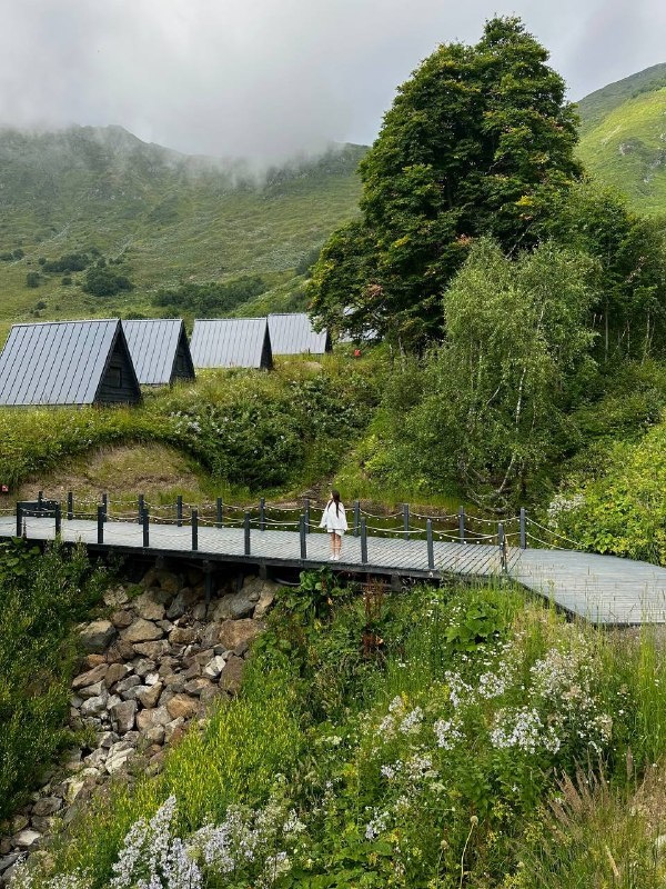 Попасть туда можно пешим маршрутом (на канатке поднимаетесь на высоту 2320м и далее идете по тропам, обозначенным маршрутом; по пути будут расположены скамейки, где вы сможете прерваться на отдых или насладиться окружающей красотой) или на трансфере (2,000 рублей с человека, примерно 20 минут в пути). На территории кемпинга расположены двухэтажные домики а-фрейм формы; ресторан, на втором этаже которого расположена зона отдыха и игр; прошу заметить, что отдельно расположен нужник (баня, комната для стирки и глажки, туалет и душевые).