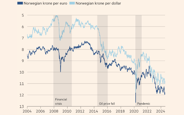 Первый спад совпал с резким падением цен на нефть в 2014 году, что жизненно важно для Норвегии, ведущего производителя нефти в Западной Европе. Второй крупный сдвиг произошел в 2022 году, когда Федеральная резервная система США начала повышать свою основную процентную ставку быстрее, чем Норвегия, увеличивая так называемый дифференциал ставок, который внимательно отслеживают валютные трейдеры.