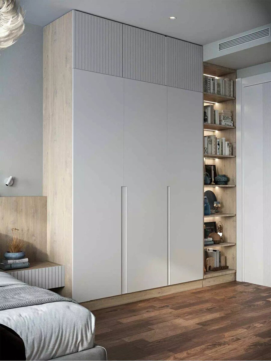 Элегантная мебель в холодных цветах для детской, с оригинальным сочетанием отделки и фактуры дерева, гладких и рифленых поверхностей, Детали тут Стильная красивая мебель в детскую комнату девочки идеально вписывается в интерьерный стиль сканди, выбранный для оформления помещения. Фоном для нее служат темное дерево напольного покрытия, серо-голубые потолок и стены. Акцентом обстановки выступает роскошная люстра с динамичной композицией. Ее округлый плафон декорирован элементами, похожими на легкие птичьи перья. Дополнительное освещение обеспечивают точечные потолочные светильники встроенного монтажа. Справа от входных дверей находится настенное зеркало в тонкой черной рамке, имеющей форму прямоугольника со скругленными углами. Еще одно, только квадратное, размещено в мейкап-зоне, слева от входа. Рядом с ним установлен торшер с золотистой Г-образной стойкой, круглой напольной опорой и цилиндрическим поворотным абажуром. Здесь же размещен кубический пуф на тонкой раме с короткими ножками,