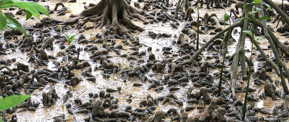 Мангровые леса - это заросли сравнительно небольшого количества древесных растений, приспособленных жить на низменных берегах, периодически затопляемых морем. Да, кстати, в разных тропических районах обитает разное количество видов мангровых деревьев - от одного до двадцати. Не смотря на приливы и отливы, а также действие стихий, береговая линия, хорошо защищённая корнями мангровых деревьев, практически не меняется, что способствует накоплению большого количества органических остатков и ила. Прежде всего, конечно-же упавших листья самих мангровых деревьев. Они то и являются основной пищей нашим улиткам Terebralia palustris.