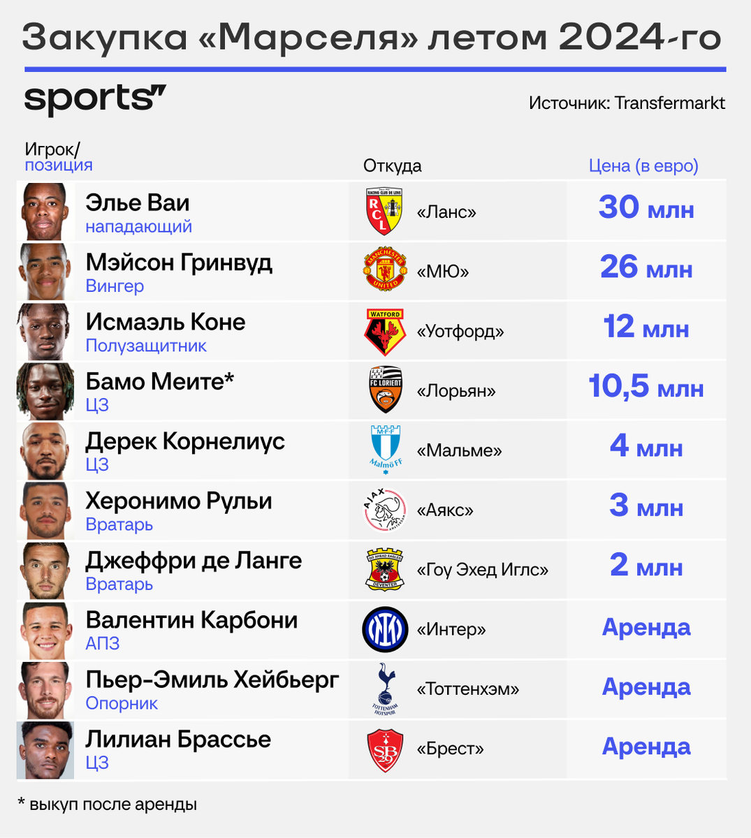 «Марсель» сильно меняется под нового тренера Роберто де Дзерби – из новых игроков можно составить новую команду. Французские медиа писали, что итальянец хочет обновить состав на 80%!
