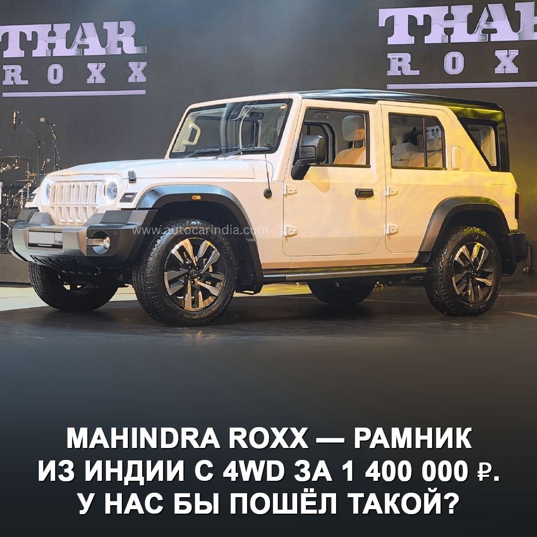 ❗️Индийская Mahindra представила новый рамный внедорожник Roxx. На родине он стоит примерно от 1 400 000 ₽. Roxx — это удлинённая версия «индийского Вранглера», так называют двухдверный внедорожник Mahindra Thar II. Габариты новинки — 4 428 х 1 870 х 1 923 мм, колёсная база — 2 850 мм. Угол въезда — 41,7°, съезда — 36,1°, рампы — 23,9°. Для сравнения: у Патриота угол въезда — 35°, съезда — 30°, рампы — 22°. Моторы — турбодизель 2,2 л на 152 или 175 л.с. (330–370 Нм), а также бензиновая двушка на 162 или 177 л.с. (330–380 Нм). Коробка — МКПП-6 или АКПП-6 от Punch Powerglide. Привод — полный подключаемый с понижайкой. Пластиковый верх кузова — съёмный. В последнее время всё чаще говорят о том, что машины из Индии могут поставлять и к нам. Как думаете, Mahindra Roxx найдёт своих покупателей? 🤔