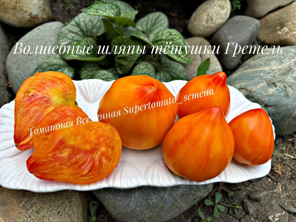 Волшебные шляпы тётушки Гретель. Tante Gretels Magische Hute, Германия. Индетерминантный, среднеспелый сорт. Куст в теплице 200 см., лист обычный, поникающий. Плоды красивейшие сердечки с острым носиком, жёлтого цвета с розовым загаром, массой 200-300 гр. Мякоть мясистая, сочная, сладкого вкуса. Восторг!