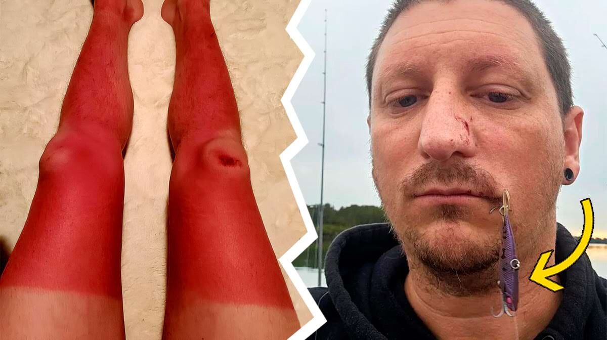 «Вчера рыбачил, сильно замахнулся удочкой и ударил вторую удочку, которая стояла позади меня в держателе. Та дёрнулась и ударила меня по лицу», — написал автор фото.