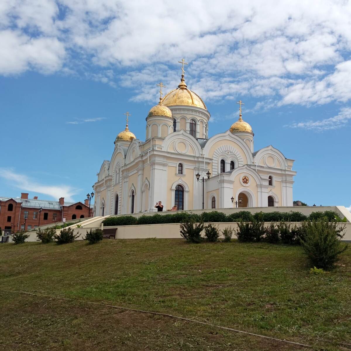 Как вы знаете из предыдущего поста, от Белопесоцкого монастыря на левом берегу Оки хорошо видна Кашира на правом, в частности -- Никитский женский монастырь на высоком берегу. Никитский монастырь не может похвалиться очень уж древней и богатой историей: в качестве собственно монастыря он основан в середине 19-го века, хотя некоторые храмы и сооружения возводились и ранее. Вот так он вдруг неожиданно увиделся: Он невелик, небогат, но совершенно замечательно расположен. С его смотровой площадки открывается великолепный вид в бесконечную даль, на заокские леса и равнины, мне кажется, я рассмотрел даже Пущино и Серпухов, но за это не поручусь) Посреди монастыря нарядный храм Преображения Господня, напоминающий праздничный торт. На территории монастыря продолжаются реставрационные работы, вероятно, готовится новое помещение для обители сестер, либо гостиница для паломников. Площадь перед храмом концентрически выложена брусчаткой, с пятачком посередине -- похоже, это должно