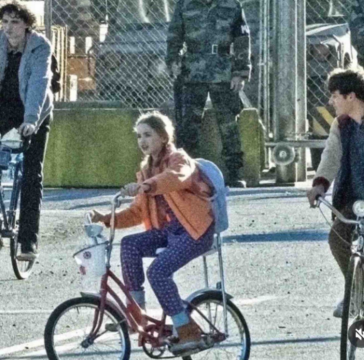 На фотографиях героиня Нелл Фишер катается на велосипеде вместе с Майком и Уиллом, а также общается с персонажем, который сильно напоминает Джейми Кэмпбелла Бауэра. Сцена происходит перед старым домом Крилов.