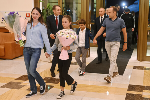 В Россию, помимо Дульцевых, вернулся Вадим Красиков, приговоренный к пожизненному заключению в Германии за ликвидацию чеченского полевого командира. На Запад улетели журналист WSJ Эван Гершкович, бывший морской пехотинец Пол Уилан, публицист Владимир Кара-Мурза (признан в РФ иностранным агентом) (признан в РФ иностранным агентом) и бывший столичный муниципальный депутат Илья Яшин (признан в РФ иностранным агентом) (признан в РФ иностранным агентом).