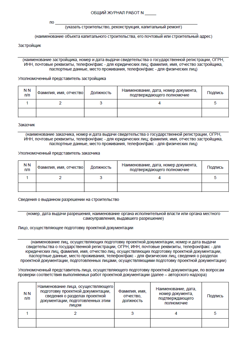 Общий журнал, в котором ведётся учёт выполнения работ по строительству, реконструкции, капитальному ремонту объекта капитального строительства (далее - общий журнал), должен отражать последовательность осуществления строительства, реконструкции, капитального ремонта объекта капитального строительства, в том числе сроки и условия выполнения всех работ при строительстве, реконструкции, капитальном ремонте объекта капитального строительства, а также сведения о строительном контроле и государственном строительном надзоре. Допускается ведение общего журнала отдельно на каждый объект капитального строительства, входящий в состав предприятия как имущественного комплекса, единого недвижимого комплекса или в состав сложного объекта (объекта, в состав которого входят два и более объекта капитального строительства), а также на отдельный этап строительства, реконструкции.