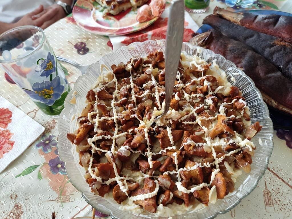 Между слоями майонез. Все овощи предварительно измельчить. А лисички обжарить на сковородке с луком.