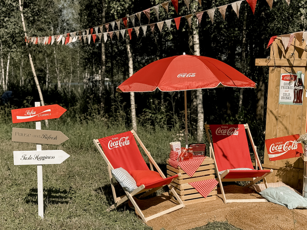 Дни рождения Софии мы оформляем уже многие годы! В этот раз девочке исполнилось 9 лет, и мы всерьёз призадумались над тематикой: малышка уже стала взрослой, а особых пожеланий по празднику она не высказала. И тут нам пришла в голову идея — яркое оформление в стиле колы! Отличный вариант для последних летних деньков. Наш декоратор Женя возвела совершенно потрясающую фотозону в красных тонах с ретро-постерами, мерчем Кока-Колы и другими милым деталями. В фотозоне мы поставили кресла Кока-Кола, чтобы именинница могла и пофоткаться, и посидеть с бутылочкой лимонада под зонтиком. Кстати, этот очаровательный топпер для пирога сшила Женя! Бутылочки и баночки колы сами по себе стали прекрасным украшением! К ним добавили букетики ромашек (всё-таки у нас лето), скатерти и салфетки, сшитые Женей. А ещё она нашла классное радио в стиле нулевых. Наша именинница даже подобрала образ под праздник с красными деталями. Кстати, тут наши неизменные гирлянды-флажки, которые мы шьём индивидуально под кажды