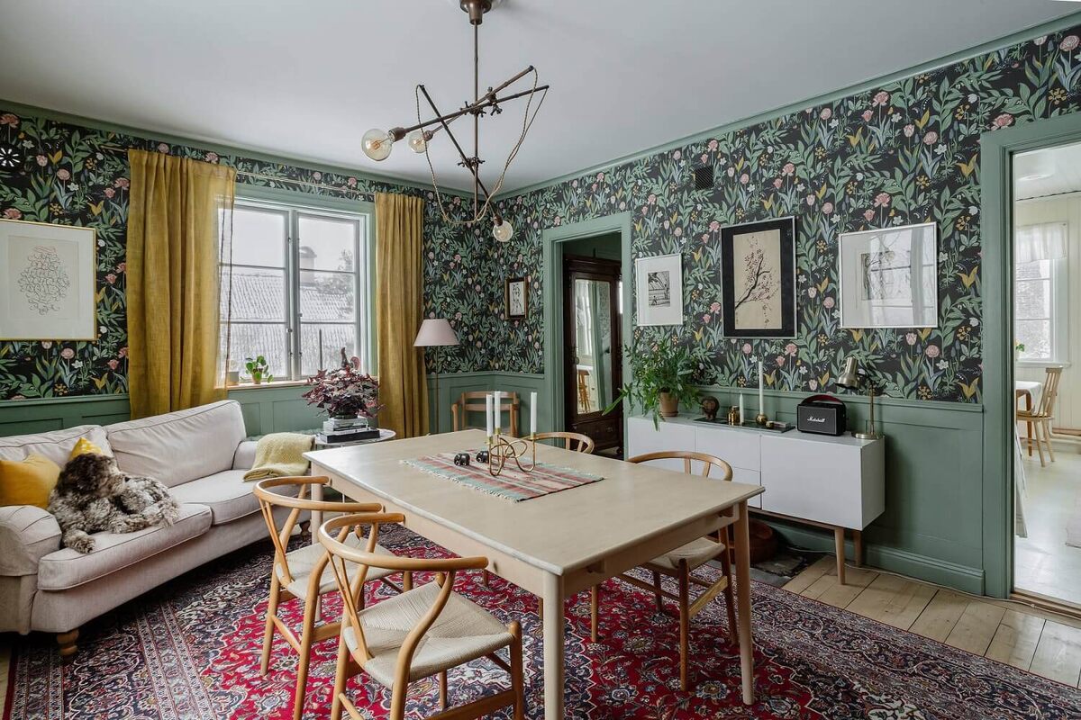 В живописном месте к югу от Стокгольма находится этот очаровательный дом, который был с любовью восстановлен его нынешними владельцами. Дом построен в 1920-х годах. Во время реконструкции владельцы попытались воссоздать атмосферу того времени. К счастью, деревянные полы сохранились, что уже добавляет дому характер. И чтобы еще больше воссоздать атмосферу 20-х годов, они украсили дом обоями с цветочным рисунком и зелеными тонами. Это не большой дом, всего 92 квадратных метра, но в нем есть но выглядит он достаточно просторным. На первом этаже разместились кухня и гостинуя. Наверху находятся две спальни и ванная комната. Лестничная площадка на первом этаже также достаточно большая, чтобы разместить небольшой домашний офис. Первое, что вы заметите в гостиной, это замечательные цветочные обои. Комната полностью оформлена обоями. Деревянные панели в гостиной окрашены в приятный зеленый оттенок, который также присутствует в обоях. Мне нравится, что хозяева не стесняются цвета и узоров в э