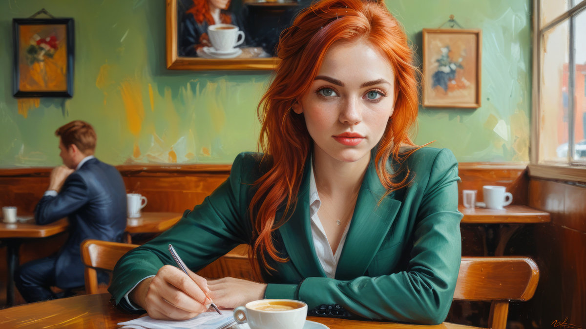 Андрей сидел в кафе, рассеянно помешивая сахар в остывшем кофе. Дождь за окном барабанил по стеклу, создавая уютный меланхоличный фон. Взгляд его блуждал по посетителям, пока не остановился на девушке, которая только что вошла. Она стряхивала капли с зонтика, её рыжие волосы блестели в свете ламп.