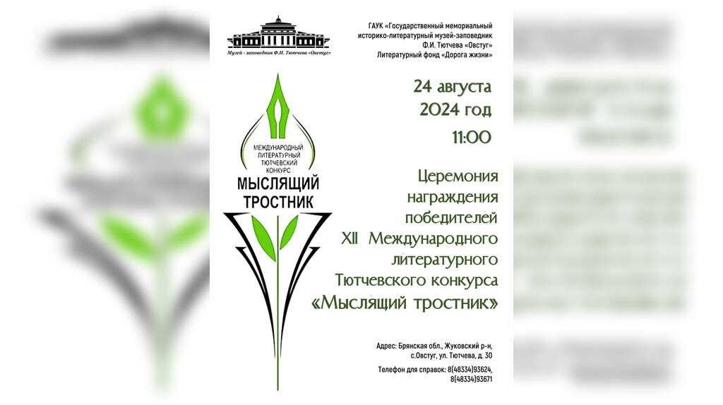В Овстуге 24 августа пройдет церемония награждения победителей XI международного литературного Тютчевского конкурса «Мыслящий тростник». На мероприятии соберутся победители и лауреаты конкурса нынешнего года, поэты, писатели и журналисты из разных городов России.