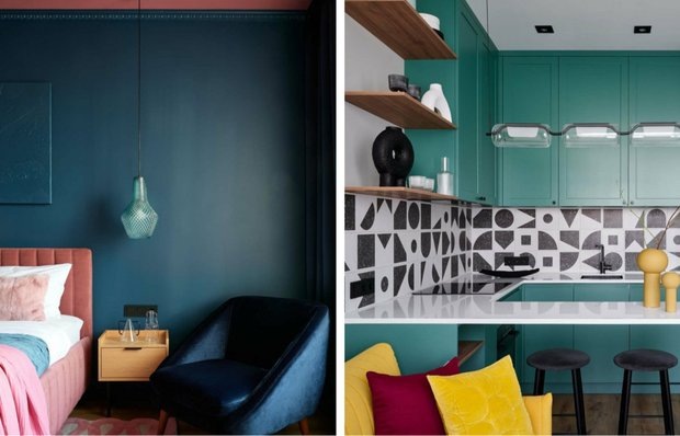 Раскрываем секреты работы с цветом на примере проекта дизайнера Дизайнер Мила Генч создала красивый цветной интерьер в обычной московской евродвушке 45 кв. м. Фирменный стиль дизайнера — много цвета, яркие и оригинальные акценты. Показываем интересные идеи из проекта, которые легко повторить и в вашем интерьере. В кухне-гостиной основной фон сделали нейтральным, а яркие тона добавили в мебели и текстиле. Для кухонного гарнитура выбрали насыщенный зеленый оттенок, рядом с зеленой кухней разместили яркий желтый диван. Таким образом получилось передать настроение через цвет и в то же время не перегрузить интерьер. Интерьер всей квартиры воспринимается целостно и гармонично благодаря использованию деталей в общей палитре каждой комнаты. Цвет как будто плавно перетекает из одного помещения в другое, используется в деталях и в декоре. Например, картины над диваном «собрали» в себе все оттенки интерьера, а рисунок повторяет принт кухонной плитки. Сложный сине-зеленый оттенок стен в спальне до