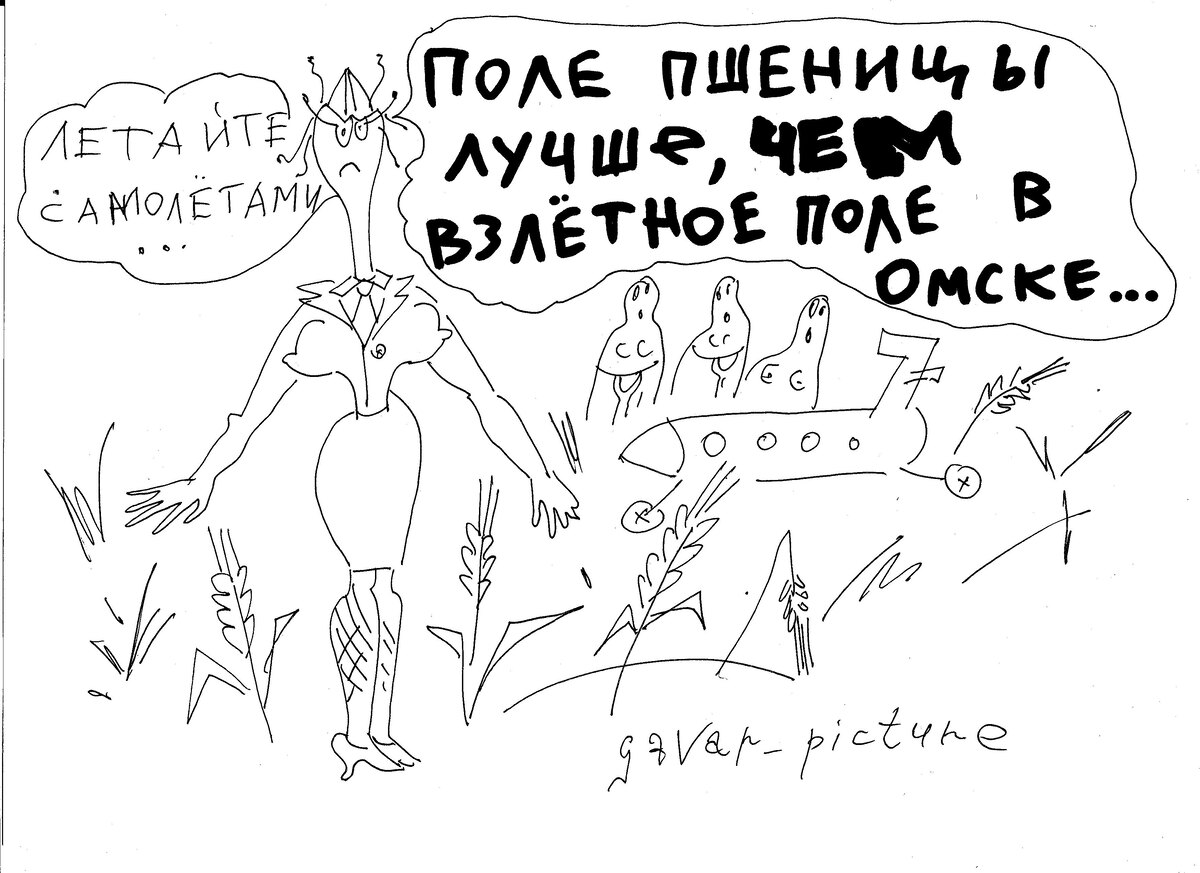 А ещё, помните, мы все наблюдали за странной тенденцией лётчиков сажать самолёты в чистом поле? В смысле, не на чистое лётное, а поле кукурузы или пшеницы? Не знаю, было ли весело пассажирам, но картинку на эту тему я нарисовала. И да… «Кукурузник» теперь не модель самолёта, а способ его приземления.