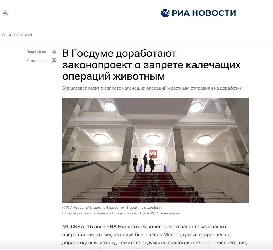 Сегодня прочитал новость про наш законопроект о запрете калечащих операций на животных. Сначала на страницах «Парламентской газеты» (тут: https://www.pnp.ru/social/burmatov-zhdet-dorabotki-zakonoproekta-o-myagkikh-lapkakh.html) под заголовком «Депутат Бурматов ждет доработки законопроекта о «мягких лапках». Затем на ресурсах первоисточника, на который ссылается «Парламентская газета», в «РИА Новости» (тут: https://ria.ru/20240815/zakonoproekt-1966291503.html) под совершенно иным заголовком: «В Госдуме доработают законопроект о запрете калечащих операций животным». Поскольку я был редактором данного законопроекта, а также в связи с тем, что мне начали задавать вопросы, что мы тут делаем, полагаю, что было бы правильно внести некоторую ясность. И так: В Мосгордуме, на сегодняшний момент, никакими доработками этого проекта никто не занимается по одной простой причине: все доработки, которые я могу предложить, были разработаны в 2023 году, обсуждены с федеральными органами исполнительно