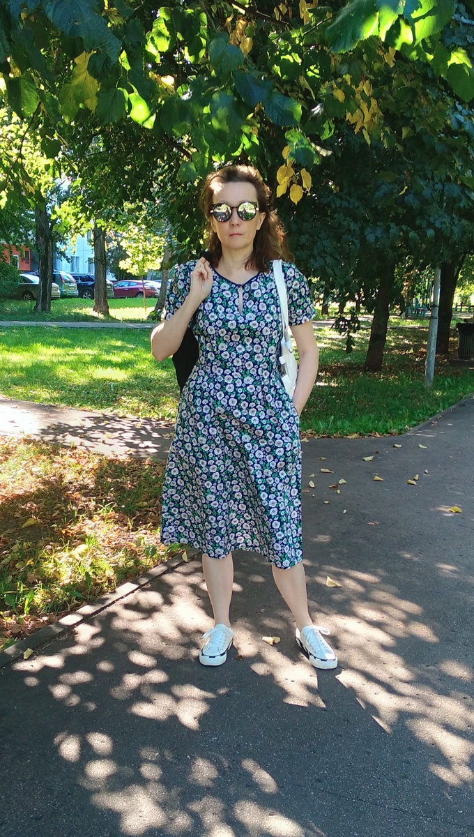 Здравствуйте. Можно встретить свою любовь с первого взгляда на скидке 490 рублей за кг. Оно висело самое первое на самом виду, висело и призывно поглядывало всеми своими глазастыми цветочками. Такое бывает редко, часто я таскаю облюбованные вещи и думаю-думаю до последнего, решение принимаю уже почти у кассы. Потратила почти 200 рублей, купила это платье и блузку, которую ещё покажу. Секрет успеха, то что платье не отрезное), оно удачно приталено прямо на мой рост, на юбке четыре неглубоких встречные складочки, на лифе они переходят в швы. То есть юбка получилась не очень пышная. Меня это очень устраивает, при маленьком росте объёмные юбки делают похожей на бабу на самовар, были такие раньше)). И карманы есть! Как же я замерзла фоткаться, светит солнце и сильный северный ветер((. Фон очень темно-синий, иногда смотрится просто чёрным. А цветы мне не надоедают, уверена, что они идут всем, надо только свои найти. Для меня цветы должны быть маленькими. На груди разрезик с пуговичкой, на