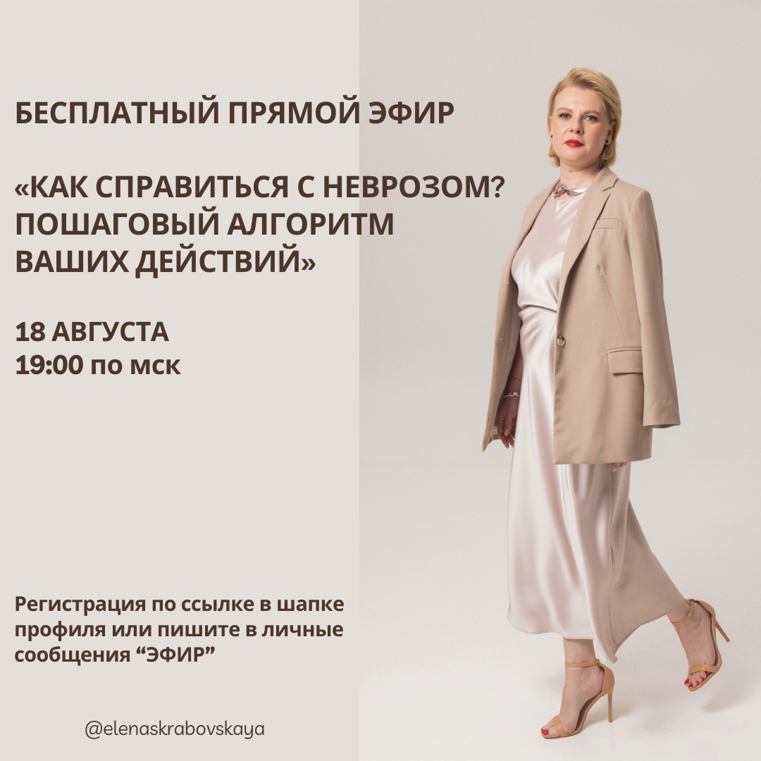 Бесплатный прямой эфир 18 августа, в 19.00 по мск. «Как справиться с неврозом? Пошаговый алгоритм ваших действий». Без воды, чётко и по делу дам инструкцию, что нужно делать, чтобы справиться с симптомами, тревогой, страхами, ипохондрией, навязчивыми мыслями. Только конкретные шаги и конкретные действия для вас. Что делать? Как делать? Какие инструменты и где их взять, чтобы помочь себе справиться с неврозом. На эфире буду отвечать на ваши вопросы. Ваши результаты после эфира: Снизите тревожность прямо на эфире Получите чёткий алгоритм действий Сэкономите время на поиски информации Перестанете засорять мозг всякой ерундой Получите практические упражнения для самопомощи Для кого эфир: 2.У кого ничего не получается и опускаются руки; 3.Для тех, кому было уже лучше, но снова отбросило назад; 4.Для тех у кого нет явных проблем, но периодически тревога, напряжение в теле и какие-то непонятные симптомы. 5.Для тех, кому нужна мотивация и поддержка; 6.Для коллег, кому нужен алг