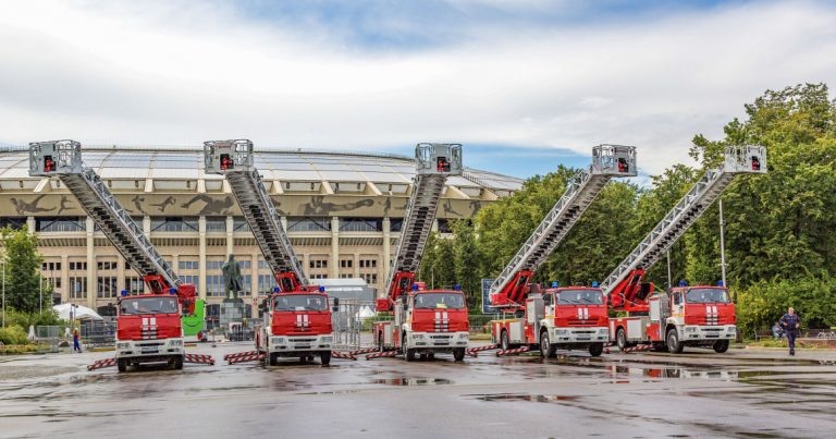Сегодня в «Лужниках» проводят вальс пожарных автолестниц под аккомпанемент оркестра