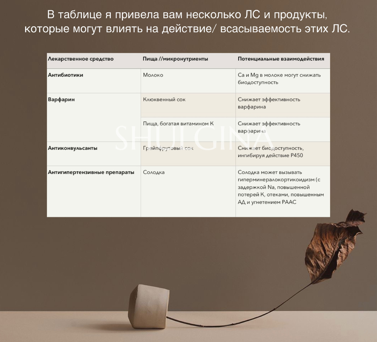 В описании приема препарата написано «принимать после еды, запивая водой» Как думаете это написано просто так? Если делают на этом акцент, то явно это важная информация ЧТО МОЖЕТ ПРОИЗОЙТИ? В фармакологии есть такое определение, как биодоступность препарата. Биодоступность - это количество лекарства, которое попадает в системный кровоток. На биодоступность могут влиять многие факторы, но в том числе и наличие/отсутствие пищи в желудке, наличие определенных веществ. Давайте рассмотрим на примере железа: Все мы знаем, что биодоступность добавок сульфата железа увеличивается, если принимать их с пищей содержащие вит.С (или дополнительно с аскорбиновой кислотой). Но если принимать добавки железа с продуктами с высоким содержанием фитата, кофе, пищевыми добавками с клетчаткой, молочными продуктами и добавками кальция, то абсорбция железа в данном случае будет ингибироваться (снижаться). ИТОГ: Если врач вам говорить принимать какой-либо препарат ДО еды, а другой препарат ВО ВРЕМЯ еды,