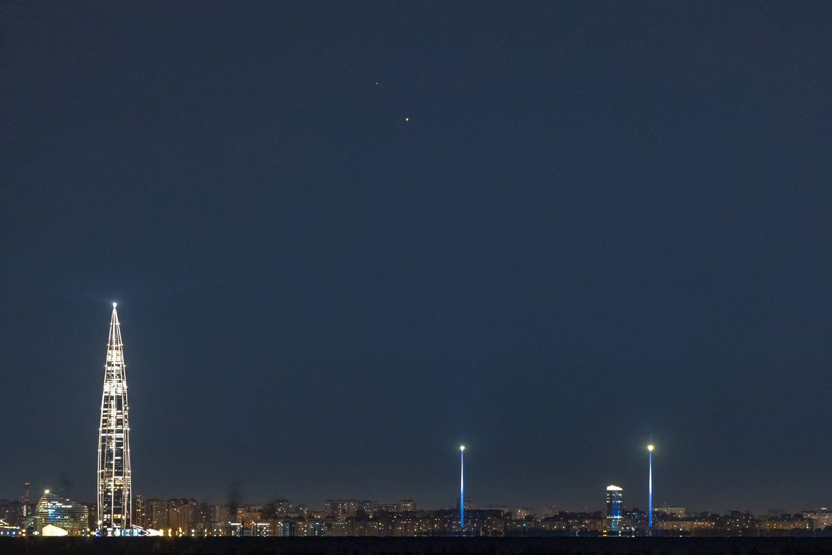 Несколько дней подряд на ночном небе Петербурга можно наблюдать Марс и Юпитер вблизи друг друга. На восходе сквозь толщу земной атмосферы обе планеты выглядят схоже — в красных оттенках, но стоит им подняться выше 10 градусов над горизонтом — и алый цвет остается только у Марса. У Юпитера же, помимо мягкой бледно-оранжевой окраски, также становятся заметнее крупные спутники — на момент съемки Ганимед, Ио, Европа и Каллисто слились в одну точку правее Юпитера, настолько близко друг к другу они были расположены.