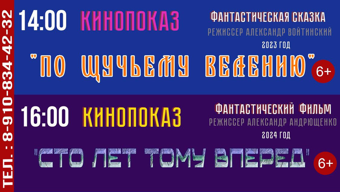 Как сообщает пресс-служба дворца, в 14:00 в малом киноконцертном зале покажут сказку "По щучьему велению" 6+, в 16:00 – фантастический фильм "Сто лет тому вперед" (6+). А в 19:00 пройдет кинопоказ фильма "Воздух" (16+)