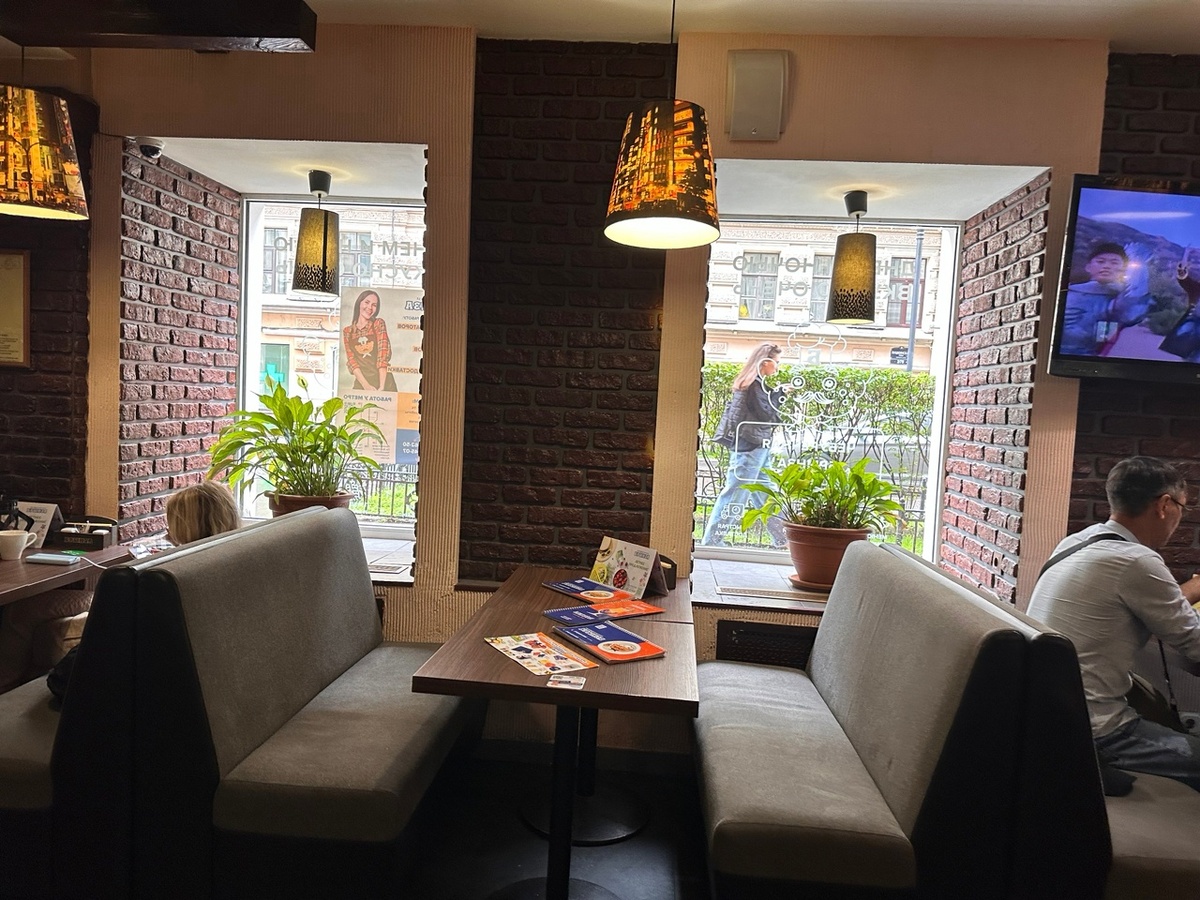 Как-то упоминала эту чебуречную, когда рассказывала, где поесть в Петербурге рано утром. На днях гуляла с подругой по центру и зашли перекусить - готова рассказать и показать детальнее. Вот обычно что вы представляете при слове "Чебуречная"? Я раньше думала, что это простой ларек (что-то вроде "шавермной"), с жареными в жире чебуреками и всё. "Брынза", как ни странно, это больше кафе-ресторанчик. тут и официанты, и комфортные столики, и уют. Но повторюсь - в "Брынзе" на Пушкинской есть ещё одно огромное преимущество - работает круглосуточно! Для туриста это очень важно. Мы с Аней заказали, чтоб эксперимент был настоящий, по чебуреку - Аня с грушей и сыром, а я решила взять фирменный - люблю сыр в составе любого блюда! Конечно, чебуреки быстро сдулись - но как красиво! Они были, на мой взгляд, действительно сочными, вкусными и очень сытными: при этом не жирными. Мы зашли именно за чебуреками, но я видела, что людей достаточно много - и они зашли именно на обед (или поздний завтрак) -