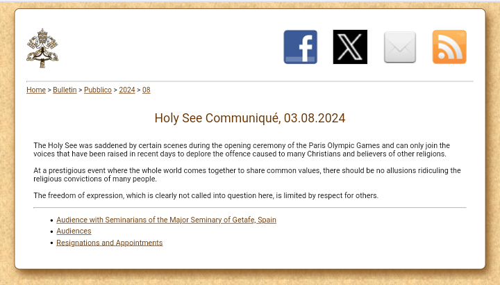 Заключительный абзац - очень забыли ревнители демократии и свободы (слова, нравов, от совести) это элементарное правило. Ватикан тактично, лаконично и твердо выразил "сожаление по поводу оскорбления, нанесенного многим христианам и верующим других религий" определенными сценами с открытия и заключил что Заявление наследников Петра и Павла - на официальном сайте Святого Престола