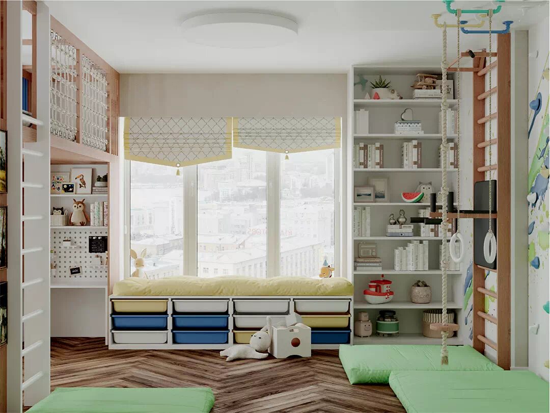 Разноцветная мебель для детской комнаты дошкольников, без спальных мест, с пространствами для всестороннего развития, игр, отдыха. Подробнее тут Мебель в детскую разнополых детей дошкольного возраста изготовлена с деталями разных цветов, поэтому она эффектно смотрится на общем белом фоне. Напольное покрытие – паркет «елочкой». Для создания освещения предназначены дисковидные накладные потолочные светильники в форме круга. Одна из стен – акцентная. Ее украшают пятна, похожие на брызги синей и ярко-зеленой краски. Рядом с ней располагается спортивная зона, пол в которой укрыт мягкими толстыми матами. Здесь брат с сестрой могут выполнять физические упражнения на шведской лестнице с перекладиной и станком для пресса, канате, гимнастических кольцах. Для лазания есть скалодром, рукоход, веревочная сетка. Выбранная мебель для детской комнаты дошкольников не предусматривает наличия кроватей. Для сна у каждого ребенка есть отдельная спальня. В комнате – два окна. Перед одним из них располагаетс