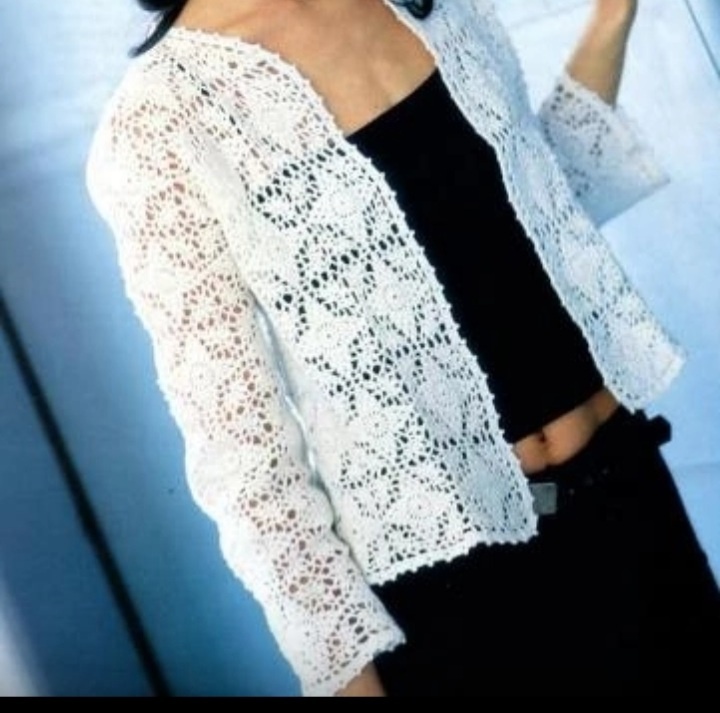 Связана кофточка тз мотивов. Скорей всего даже не кофточка а летний воздушный жилет.Очень эффектно смотрится в белои цвете на фоне черного платья. И вот пожалуйста схема вязания мотивов. Дано описание вязания а также схема половинки мотива , в каком порядке присоединять. Для опытных мастериц не составит труда разобраться. А новички пишите , если хотите вместе со мной связать данный мотив .Свяжем целый и половинку а также будем присоединять мотивы между собой. Жду ваши комментарии.