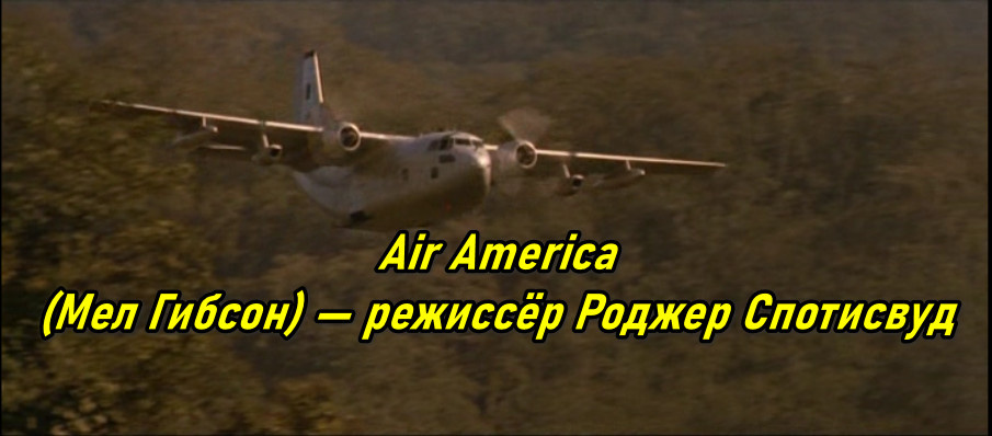 - Эйр-Америка — 1990 Air America (Мел Гибсон) — режиссёр Роджер Спотисвуд. Здравствуйте, друзья. Когда режиссёр Роджер Спотисвуд в 1990 году выпустил приключенческий фильм «Эйр-Америка» я был моложе на тридцать с лишним лет. И в силу своего возраста меня интересовали многие вопросы. Одним из которых было кино в разных проявлениях. Тогда же, мне счастливому обладателю видео магнитофона попалась видео-кассета (конечно-же пиратская) с этим фильмом. А зная Мела Гибсона в лицо, у меня не возникло сомнений в приобретении оной. В нашей стране фильм пользовался большой популярностью. Он достаточно боевой, приключенческий и весёлый. Это фильм из долгоиграющей категории. Я о том, что его можно периодически посматривать. Надо отметить, что Гибсону оказывали посильную( и не только) помощь следующие актёры - Роберт Дауни-младший, Нэнси Трэвис, Кен Дженкинс. Это так сказать — почти в главных ролях. Были и безымянные помощники. Короче, если вам нравятся динамичные приключения — вам сюда. Переходим по