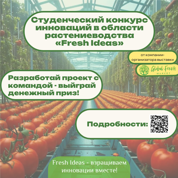 Друзья, команда Плодоовощного союза и Global Fresh Market в рамках проведения Третьей международной специализированной выставки-форума производителей и участников рынка плодоовощной продукции «Global Fresh Market: Vegetables & Fruits», анонсирует старт студенческого Конкурса инноваций в области растениеводства «Fresh Ideas»! Одной из основных текущих проблем, которая существенно тормозит развитие агропромышленного комплекса страны является сложность вовлечения в сельское хозяйство молодёжи.