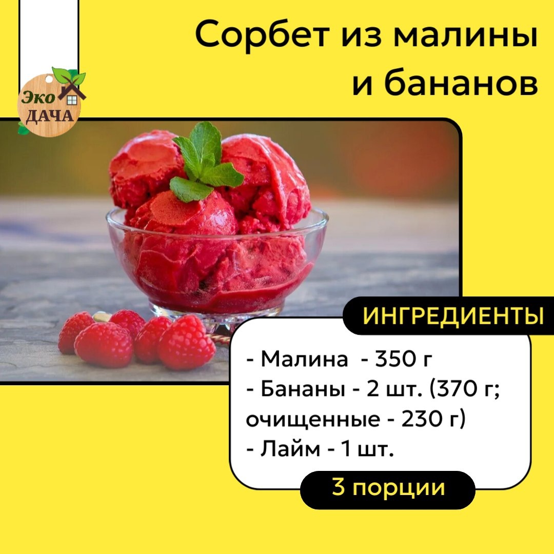 Сорбет из малины и бананов 🍧 👨🏻🍳ПРИГОТОВЛЕНИЕ: 1️⃣Бананы очистите от кожуры и нарежьте кружочками. 2️⃣Выложите малину и нарезанные бананы в форму, подходящую для морозилки. Поставьте в морозильную камеру на 2 часа, пока ягоды и фрукты не замерзнут. 3️⃣Переложите замороженные малину и бананы в чашу блендера. Натрите цедру лайма и выжмите сок, добавьте в чашу блендера. 4️⃣Взбейте все ингредиенты до получения однородного пюре. При необходимости можно добавить немного ледяной воды. 5️⃣Перелейте получившуюся массу в контейнер, накройте крышкой и поставьте в морозильную камеру на 1 час для стабилизации консистенции. 6️⃣Готовый сорбет из малины и бананов можно украсить свежей мятой. Приятного аппетита! 😋 👩🌾Ингредиенты в карточке выше #рецепт Дом и Сад