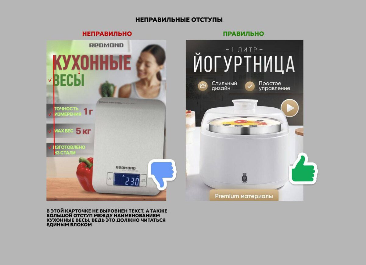 Если ты начинающий дизайнер инфографики или действующий селлер, который заказал карточки для своего товара, тебе будет полезна данная статья. Она может стать своего рода методичкой при создании карточек или для внесения правок в уже готовый дизайн. ❌Неправильные отступы у элементов. Неправильные отступы у элементов часто встречаются в работах. Например, между УТП (уникальные торговые предложения). Это визуально портит карточку товара и создает ей незавершенный вид. ❌Разный стиль иконок в УТП. Из-за данной ошибки возникает визуальный шум, взгляд покупателя рассеивается и не может выделить главное. ❌Разные шрифты. И, конечно же, шрифты. Наличие огромного разнообразия шрифтов может сыграть злую шутку, особенно, если в одной карточке большое их количество. Лучше выбирать 1-2 шрифта, которые лаконично впишутся в дизайн вашей карточки. С какой ошибкой вы чаще всего сталкиваетесь?