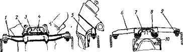 И СПОСОБЫ РЕГУЛИРОВКИ АГРЕГАТОВ. СИЛОВОЙ АГРЕГАТ. На автомобиле устанавливается силовой агрегат ЯМЗ-238 (двигатель со сцеплением и коробкой передач) производства Ярославского моторного завода. Подробное описание устройства двигателя, сцепления и коробки передач, а также указания по эксплуатации и регулировке этих агрегатов приедены в отдельной инструкции «Двигатели ЯМЗ-236 и ЯМЗ-238», которая прилагается к каждому автомобилю. В настоящем Руководстве даны необходимые сведения только тем узлам, механизмам и системам, которые не вошли в инструкцию по эксплуатации двигателя. Подвеска силового агрегат (рис. 6). Силовой агрегат крепится: раме в четырех точках на эластичных опорах, состоящих из резиновых подушек 4, 8 и 1/и скоб 3, 7 и 12, Передней и задней опорами силовой агрегат устанавливается на специальные балки 1 и 5, прикрепленные к лонжеронам рамы, а средними - не посредственно на раму. Передняя и средине опоры несущие, задняя опора (поддерживает коробку передач) уст