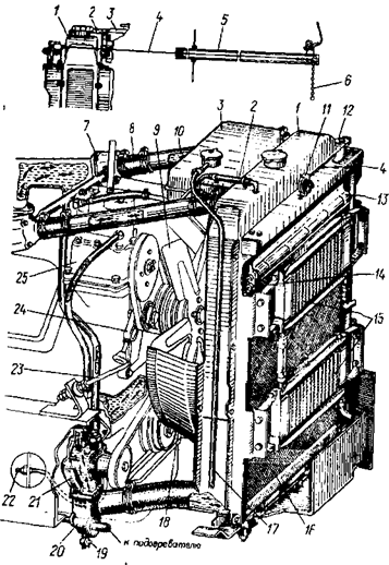 СИСТЕМА ОХЛАЖДЕНИЯ ДВИГАТЕЛЯ. Температуру охлаждающей жидкости двигателя можно регулировать не только автоматическими термостатами, но и вручную, изменяя количество воздуха, проходящего через радиатор. Для этого перед радиатором установлена шторка, управляемая цепочкой из кабины водителя. К системе охлаждения подсоединены котел пускового подогревателя и насосный агрегат. Водяной радиатор 1 (рис. 8) состоит из верхнего и нижнего бачков, соединенных охлаждающим элементом — остовом. Остов радиатора собран из вертикально расположенных плоских трубок, связанных охлаждающими пластинами, и вместе с бачками прикреплен к рамке радиатора. К нижнему основанию рамки приварены два болта, которыми радиатор крепится к первой поперечине рамы. В вертикальном положении радиатор удерживается с помощью тяг 23 бокового креплении. Верхний бачок с помощью двух патрубков 10 и резинотканевых шлангов 8 соединен с водяными коллекторами через коробки термостатов 7, а нижний бачок — с распределительным патрубком 2