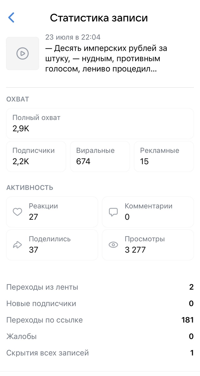 Давайте посчитаем, сколько денег может заработать автор книги с одного поста в группе ВКонтакте. Вводные данные: Итого: Человек, прочитавший весь цикл, приносит автору 220 рублей. Стоимость одного качественного перехода в таргетированной рекламе составляет от 5 до 10 рублей. Теперь посмотрим, сколько переходов может дать один бесплатный пост в ВКонтакте. Этот пост дал автору 181 переход. Важно отметить, что это горячая аудитория, которая регулярно читает книги на сайте Автор.Тудей. 181 умножаем на среднюю цену перехода 7.5 рублей, и получаем 1357 рублей. То есть, если бы вы запускали таргетированную рекламу ВКонтакте на свою книгу, это стоило бы вам 1357 рублей. И это при условии, что человек, который запускает рекламу, уже знаком с вашей книгой и имеет подходящую горячую аудиторию. В противном случае цена будет еще выше. Теперь посчитаем, сколько вы заработаете дополнительно на продаже своих книг после публикации поста. Если у вас интересная книга, а аудитория, переходящая по