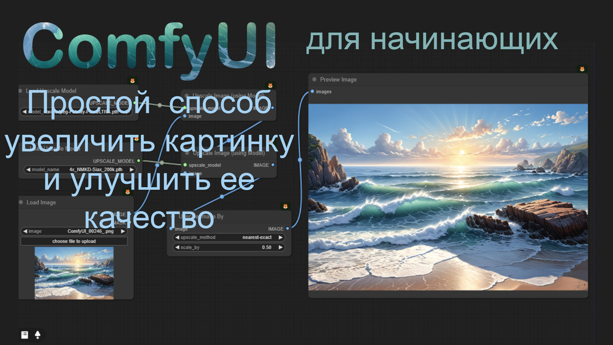 Сегодня расскажу о самом простом базовом апскейле в ComfyUI. Нет, это не самый крутой и лучший метод увеличения размеров изображения. Но он именно базовый, меньше всех нагружает ресурсы компьютера, прост и не требует никаких дополнительных установок. И если в качестве основного метода апскейла обычно подбирают более мудреные, то как дополнительный элемент схема, которую я вам покажу, используется на каждом шагу. На этом канале я рассказываю об основах работы в интерфейсе ComfyUI. На канале есть уроки для совсем начинающих. Так что если вы вообще еще не знаете, как подступиться к этому интерфейсу, советую посмотреть мои видео-уроки, там я все очень подробно объясняю. Итак, что же хорошего в том методе, который я вам собираюсь показать. Как это работает. Используются ноды, название которых начинается с Upscale image. Вся работа происходит с пиксельным изображением без кодирования / декодирования его в латентные данные. Теперь разберем ноды, которые можно использовать для апскейла изображ