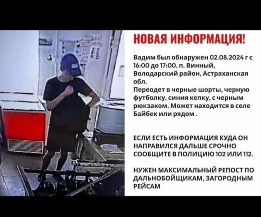 Сегодня в поисковом отряде нашей редакции подтвердили, что мальчик был замечен в Володарском районе на территории поселка Винный. Идентифицировать Вадима сразу было нелегко, так как юноша одет в другую одежду – черные шорты, футболку, на голове у подростка синяя кепка. Однако родители, которым и прислали этот стоп кадр, сразу узнали своего сына.