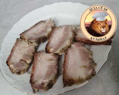 Ингредиенты: Грудинка свиная бескостная; Соль поваренная – 20 г/кг; Сахар - 2 г/кг; Перец чёрный молотый – 1,5 г/кг; Чеснок – 4 зубка. Приготовление: Грудинку моем под проточной водой и обсушиваем бумажными полотенцами. Смешиваем соль, сахар и чёрный молотый перец. Грудинку со всех сторон натираем полученной смесью. Чеснок очищаем, ополаскиваем, нарезаем пластинками и нашпиговываем им грудинку. Натертую и нашпигованную грудинку плотно заматываем в фольгу, укладываем на противень (шкуркой вниз). Противень отправляем в духовой шкаф и запекаем при температуре 150°С в течении 2,5-3,5 часов, в зависимости от величины грудинки. За полчаса до готовности грудинки разрезаем фольгу сверху освобождая грудинку и увеличиваем температуру до 180°С. По готовности грудинку достаем из духовки, освобождаем от фольги и даем остыть. Остывшую грудинку отправляем на ночь в холодильник. Утром можно пробовать. Приятного аппетита.