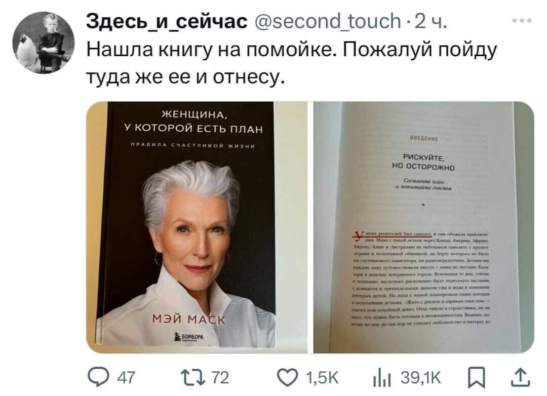 Это я к тому, что иногда стоит не одну фразу выхватить, а поинтересоваться контекстом. Итак, расскажу чуть подробней. Читала давно, но до сих пор чувство довольно приятное от книги. Многие считают, что писала она не сама, а нанятый писатель. Не считаю, что это делает книгу хуже или лучше. тут ведь смысл именно в том, чтобы получить впечатление о жизни известной персоны. В прошлом году, например, книга принца Гарри наделала много шуму. В таких рассказах интересно именно узнать о каких-то малоизвестных или вообще неизвестных фактах биографии и попытаться понять, что сделало этого человека знаменитым – ну, кроме имени или рождения в семье королевских особ) Мэй Маск Женщина, у