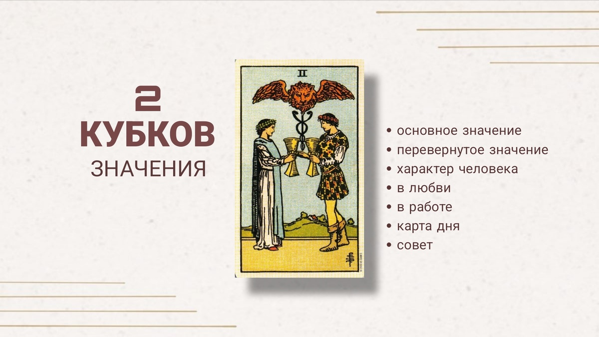 В общих чертах 2 Кубков очень нежная карта, является мощным символом гармонии, единства и взаимопонимания.Она напоминает нам о важности отношений в нашей жизни и о том, что истинное сотрудничество и поддержка могут привести к благоприятным результатам. Независимо от того, рассматриваем ли мы ее в контексте любви, дружбы или профессионального взаимодействия, эта карта вдохновляет нас стремиться к эмоциональной близости, открытости и уважению к другим.
