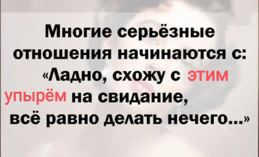 Все серьёзное начинается с несерьезного. Эту фразу можно часто видеть в мужских анкетах на сайтах знакомств. Упыри какие-то 😄
