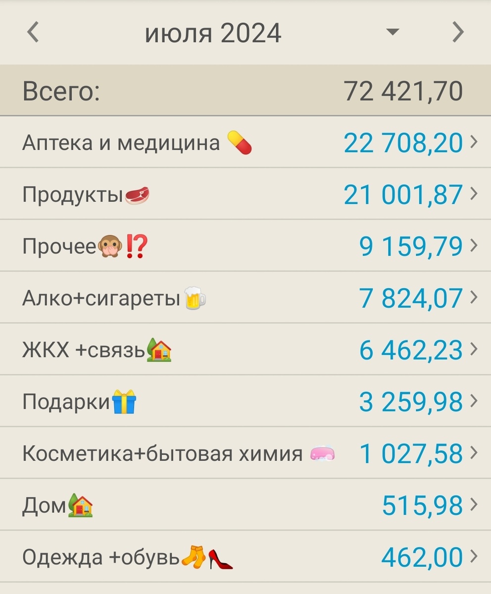 Был ли июль для нашей семьи экономным месяцем? Не думаю. Особенно расходы на здоровье. Но об этом чуть позже. Вообще, я пишу финансовые отчёты каждый месяц. Поэтому приглашаю почитать в подборке: Теперь к июлю. Доходы составили 59.813, 37 руб. из них: ✅Моя зп - 48.978, 69 руб. Тут была премия и работа за коллегу. ✅Авито - 4859,00 руб. Удалось удачно продать ненужные вещи. ✅% по вкладам - 3953,99 руб. ✅Кэшбек - 1607,74 руб. ✅Прочее - 413,95 руб. Обменяла баллы втб. Теперь к расходам. Они составили 72.421,7 руб. 💰Аптека и медицина. Сдавали анализы, муж ходил к зубному, аптека. Тут ничего не убавить. Цены-космос🤷♀️ 💰Продукты. Вышли за рамки лимита в 18т,даже не могу объяснить почему. 💰Прочее. Проезд, подписка, стрижка. 💰Вредные привычки. Ура, сумма меньше 10тыс. 💰Подарки. Тут запланировано было. 💰Косметика и бытовая химия. Купила карандаш для бровей, тушь, влажные салфетки, сухой шампунь, прокладки, кондиционер для белья, ватные диски, туалетная бумага, освежитель, ав
